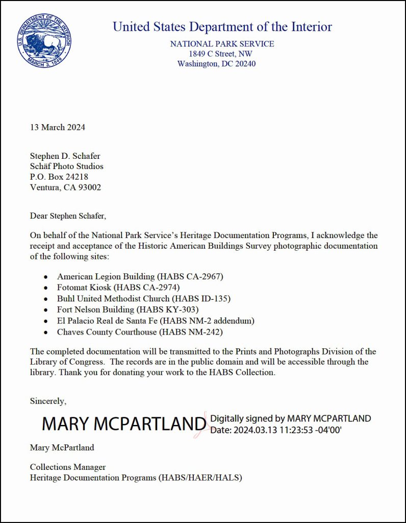 Six diverse HABS projects were accepted today by Heritage Documentation Programs of the National Park Service, Department of the Interior. These donated HABS photography surveys range from the earliest colonial history of the west to modern conveniences found in 4000 shopping center parking lots in the 1970s.